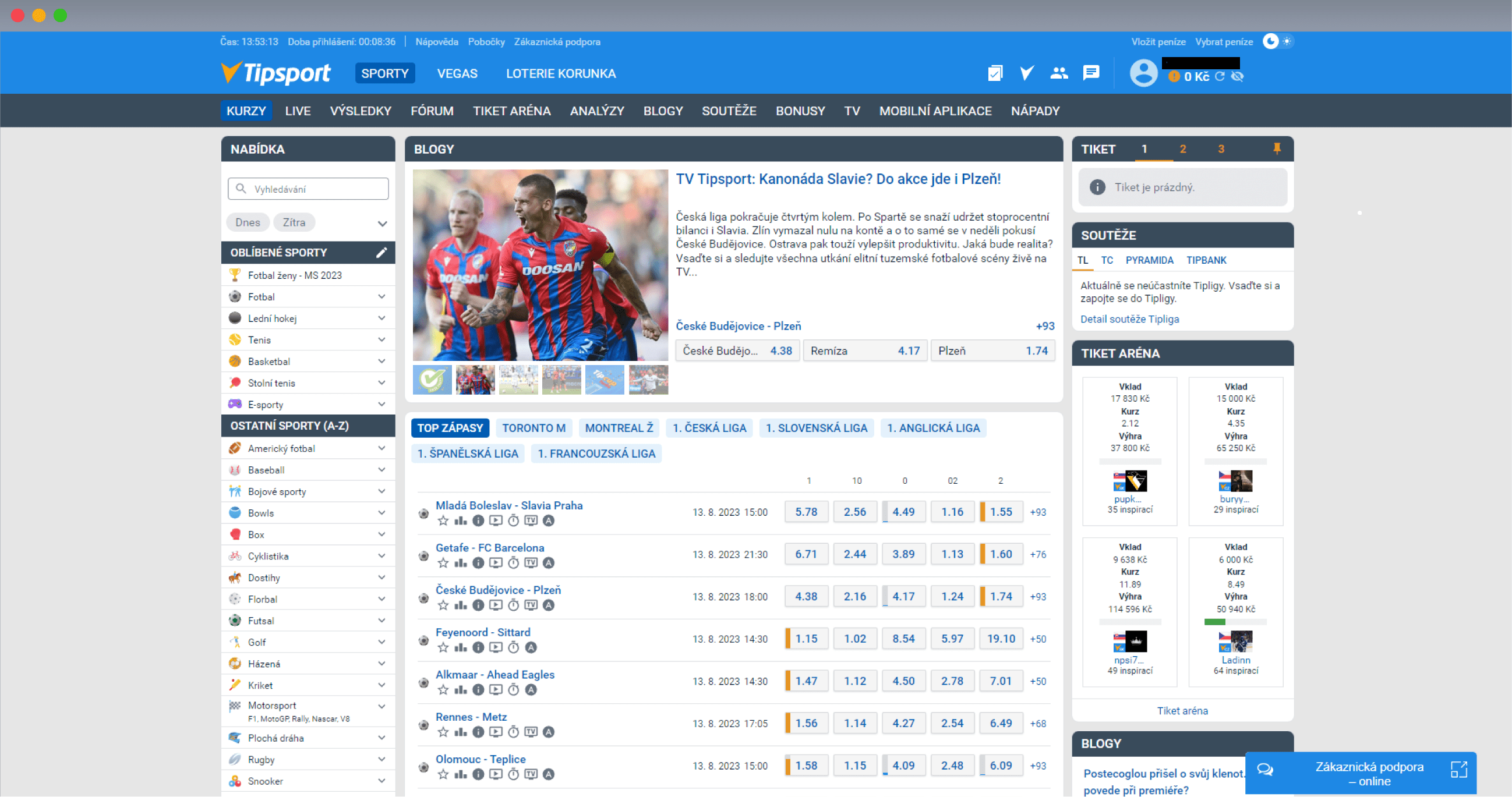 Webové stránky Tipsportu působí jednoduše a jsou snadno orientovatelné. Barvy stránek kombinují bílou, černou a modrou, což vede k výraznému kontrastu. Navigační rozhraní je intuitivní a uživatelsky přívětivé. Je však poznat, že je platforma Tipsportu velice stará a potřebovala by velký update. Zahrnuje základní sekce, jako jsou kurzy, live, výsledky, diskusní fórum, bonusy atd. V sekci s kurzy naleznete vlevo navigační menu se všemi sporty. Po vybrání konkrétního sportu se vám ukáže přehled dostupných lig a událostí. Výběrem kurzu přidáte zápas na svůj tiket, umístěný v pravém horním rohu. Zde můžete také upravovat svůj tiket, přidávat nebo mazat zápasy.